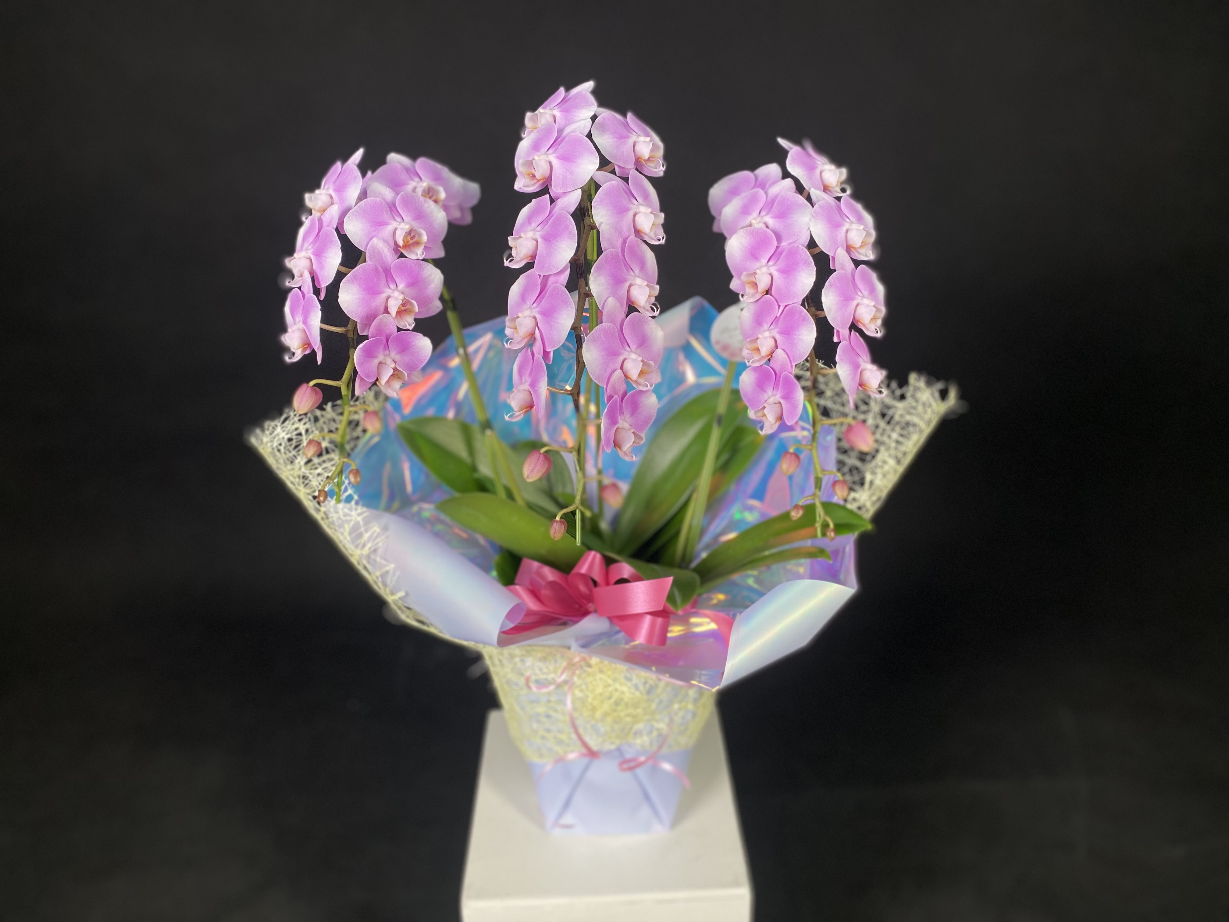上品なピンク色の胡蝶蘭を3本立てで仕立てた、華やかさと格調を兼ね備えたフラワーギフトです。